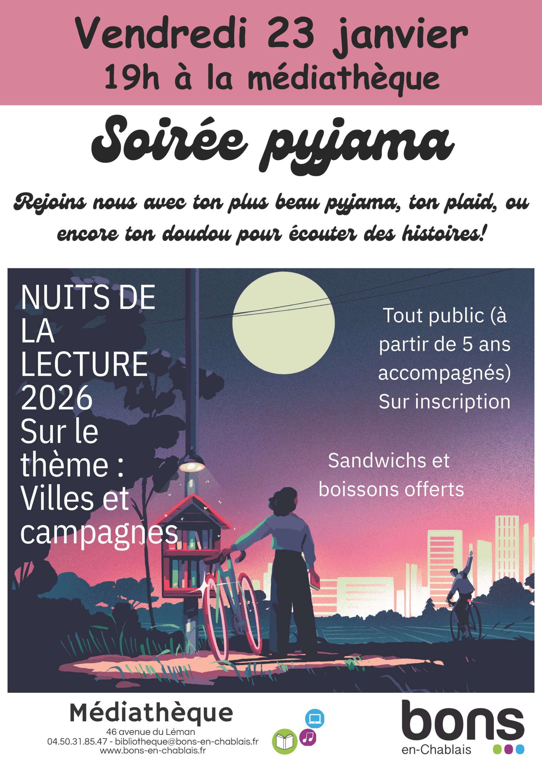 Dans le cadre des nuits de la lecture 2026, la médiathèque propose une soirée pyjama, dès 19h, à la médiathèque.
