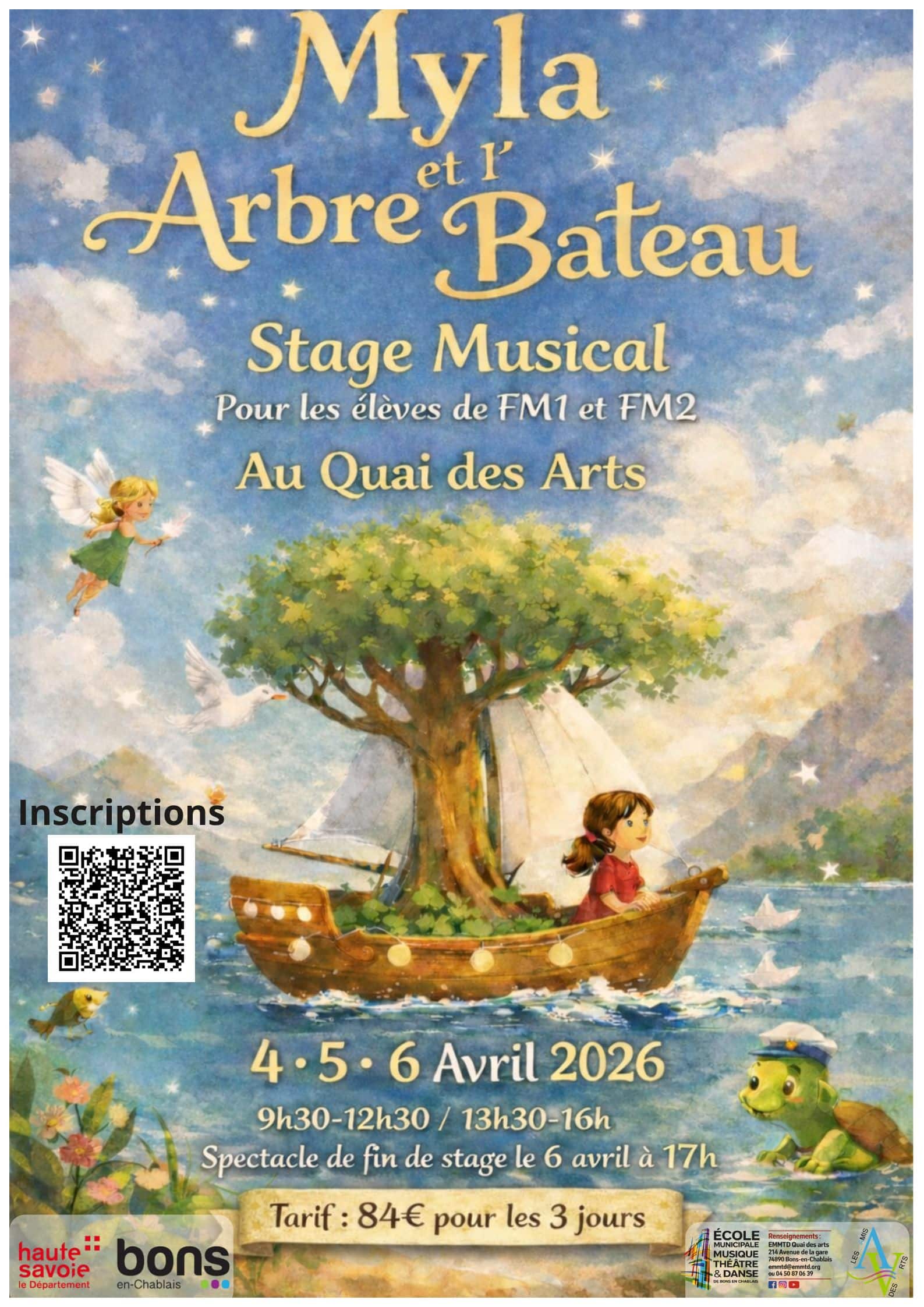 Stage musical "Myla et l'arbre bâteau", les 4-5 et 6 avril, 9h30-12h30/ 13h30-16h, au quai des arts.